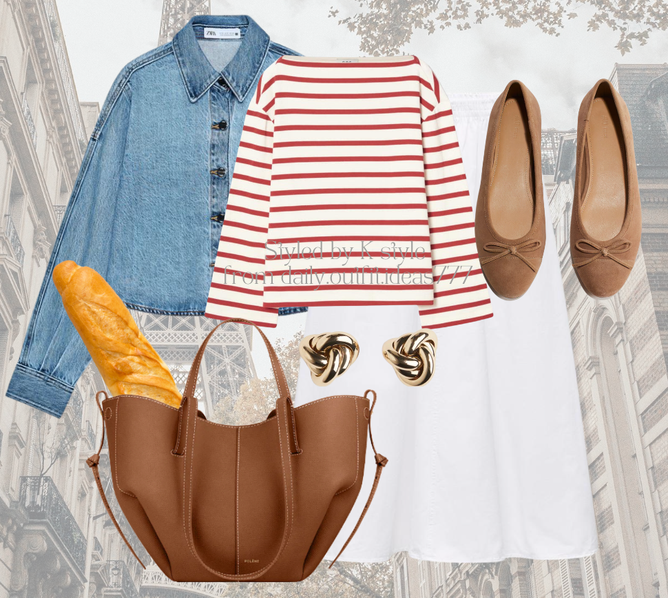 ・かごバッグを合わせて、ナチュラルな抜け感とフレンチらしい雰囲気を演出